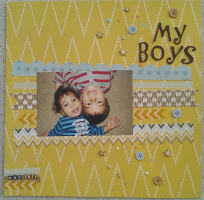Who doesn't love the messy faces of a toddler self feeding, and what's messier then spaghetti! I've paired these wonderful pictures of my youngest with ScrapbookSteals MWM Amber # 6 sketch and About A Boy's April 1 Challenge : Use Chevrons, which just happens to be another love of mine. :)